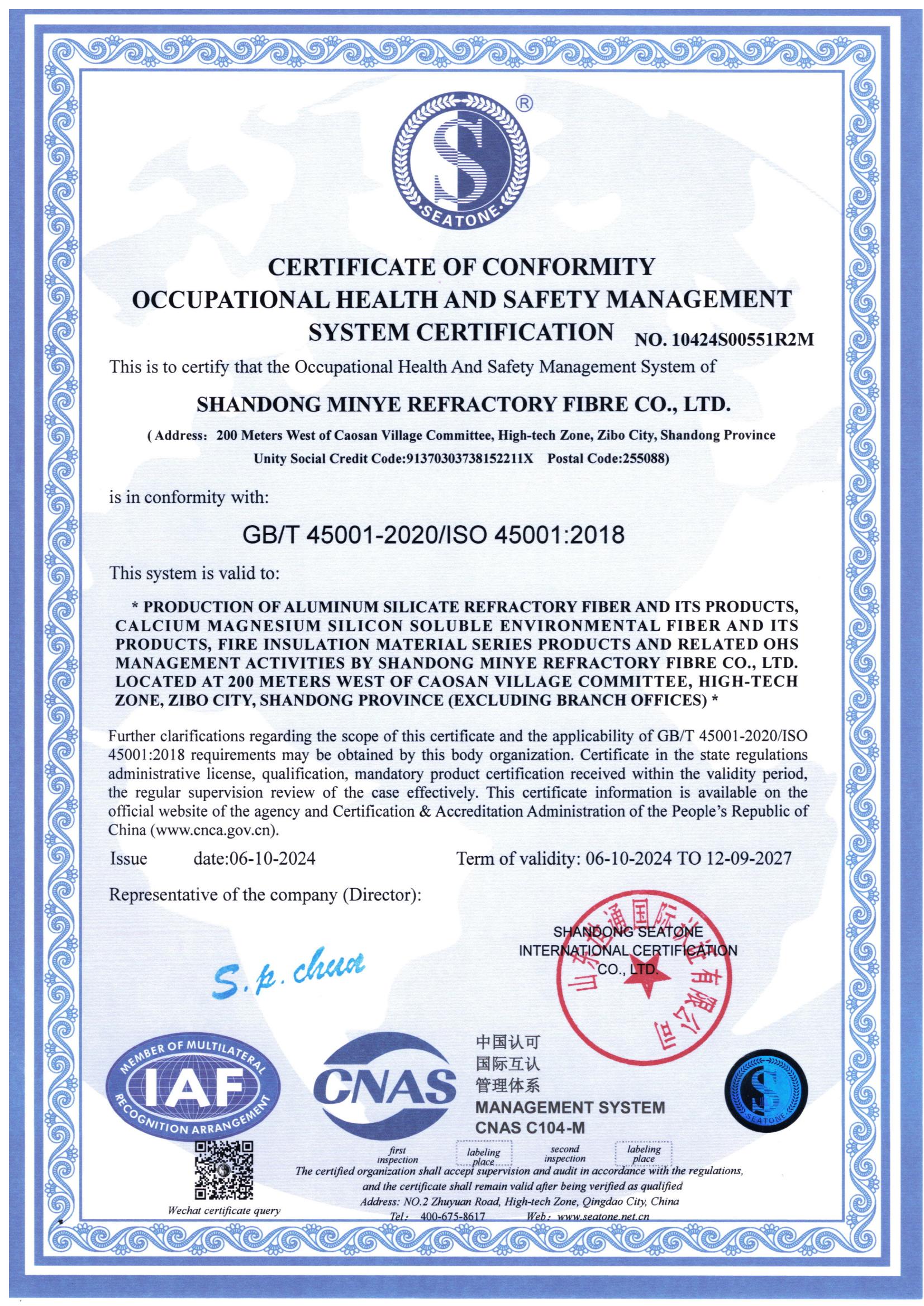 • 職業(yè)健康安全管理體系認證證書